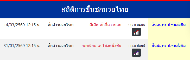 | ขึ้นชกล่าสุด | 31/1/2569 (1 เดือน 11 วัน) |