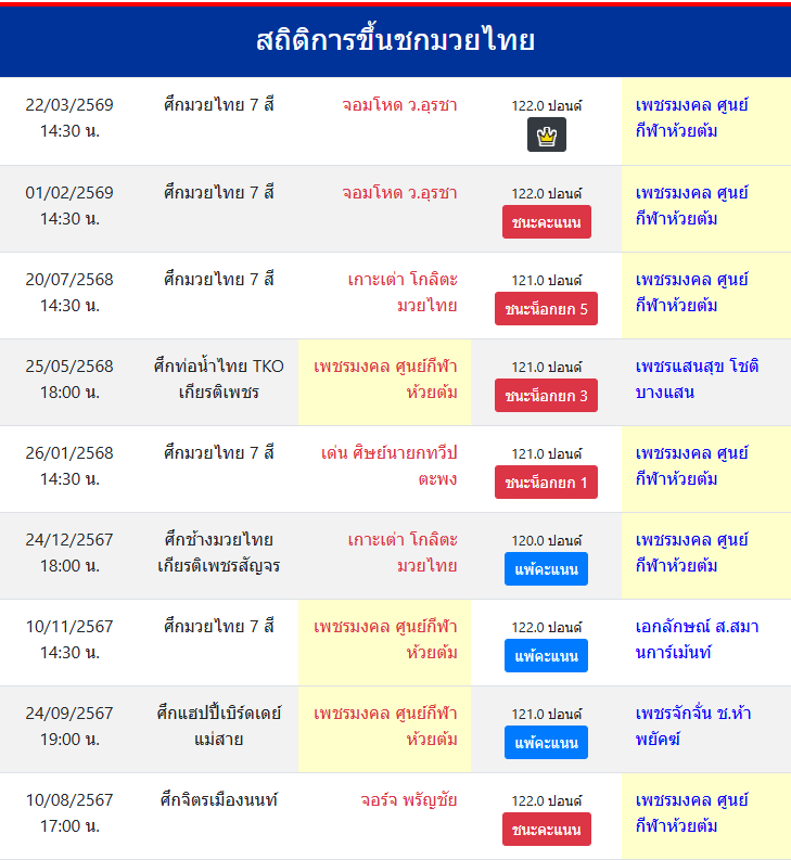 | ชกมาแล้ว | ≥ 100 ครั้ง |