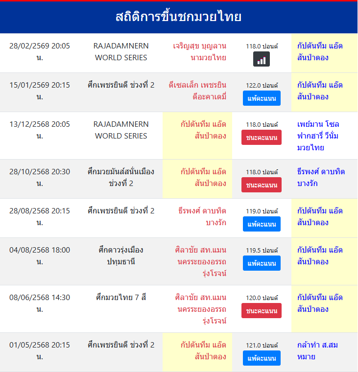 | ขึ้นชกล่าสุด | 15/1/2569 (1 เดือน 11 วัน) |