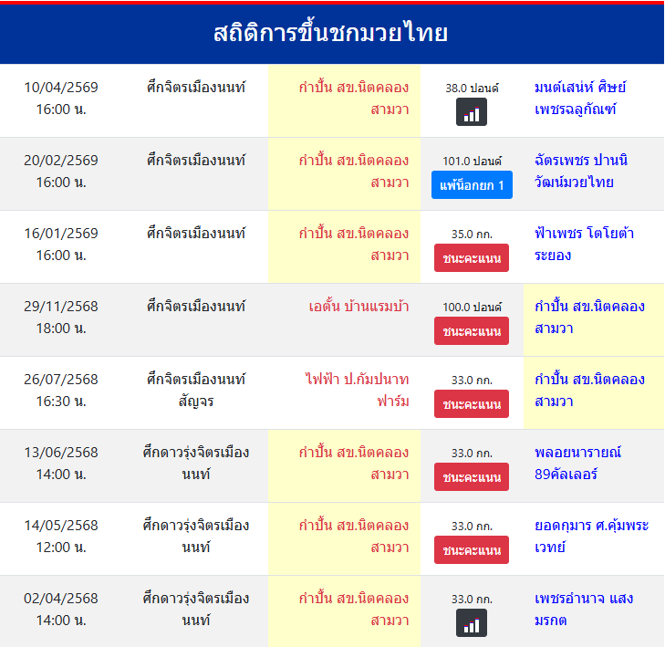 | ขึ้นชกล่าสุด | 20/2/2569 (1 เดือน 20 วัน) |