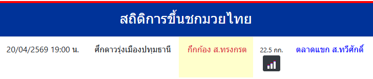 กึกก้อง ส.ทรงกรต "กึกก้อง ส.ทรงกรต" ประเทศ 🇹🇭 ไทย ลีก Muay Thai 0 ชนะ 0 แพ้ 0 เสมอ 0 KO/TKO ประวัติและชีวประวัติ สถิติการขึ้นชกมวยไทยกึกก้อง ส.ทรงกรต ขึ้นชกล่าสุด17/3/2569(1 เดือน 3 วัน)