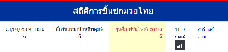 ขุนศึก ทีวันไฟต์อะคาเดมี "ขุนศึก ทีวันไฟต์อะคาเดมี" ประเทศ 🇹🇭 ไทย ลีก Muay Thai 0 ชนะ 0 แพ้ 0 เสมอ 0 KO/TKO ประวัติและชีวประวัติ สถิติการขึ้นชกมวยไทยขุนศึก ทีวันไฟต์อะคาเดมี