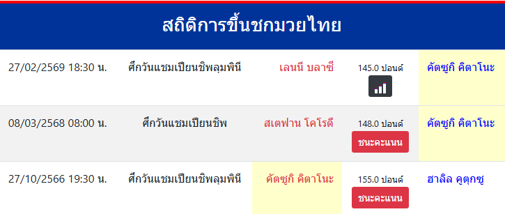 | ขึ้นชกล่าสุด | 8/3/2568 (11 เดือน 18 วัน) |