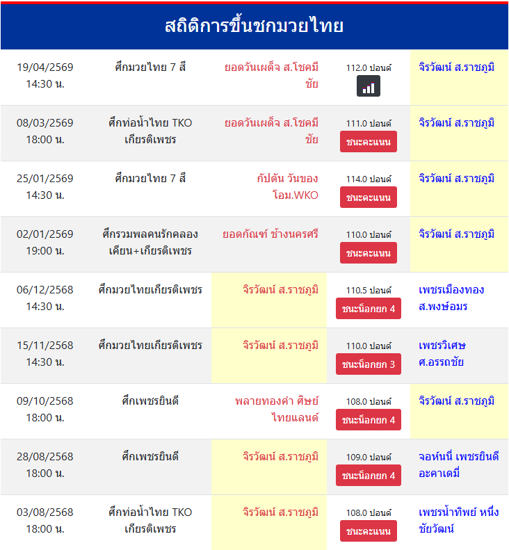 | ขึ้นชกล่าสุด | 8/3/2569 (1 เดือน 6 วัน) |
