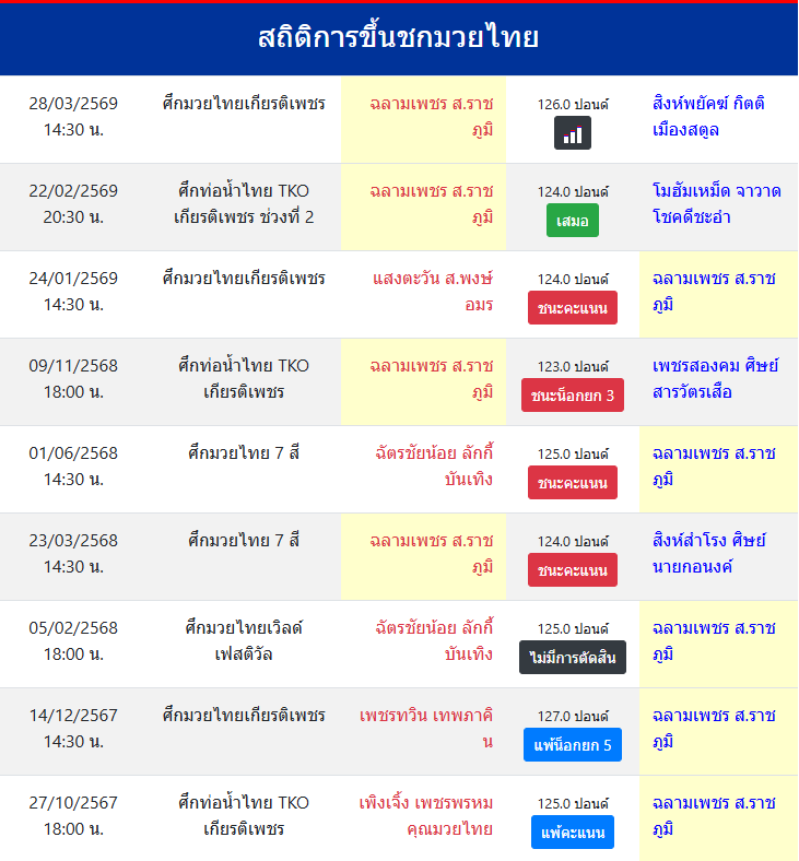 | ขึ้นชกล่าสุด | 22/2/2569 (1 เดือน 6 วัน) |