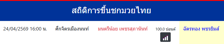 ฉัตรทอง พชรยิมส์ "ฉัตรทอง พชรยิมส์" ประเทศ 🇹🇭 ไทย ลีก Muay Thai 0 ชนะ 0 แพ้ 0 เสมอ 0 KO/TKO ประวัติและชีวประวัติ สถิติการขึ้นชกมวยไทยฉัตรทอง พชรยิมส์