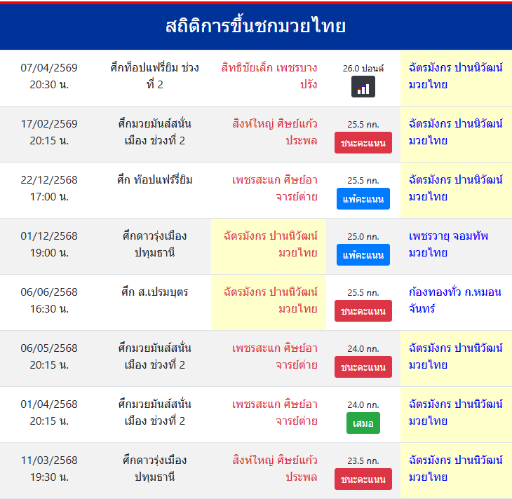 | ขึ้นชกล่าสุด | 17/2/2569 (1 เดือน 19 วัน) |