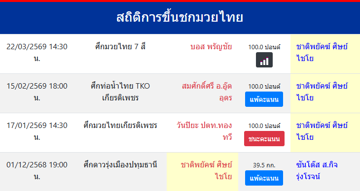 | ขึ้นชกล่าสุด | 15/2/2569 (1 เดือน 5 วัน) |