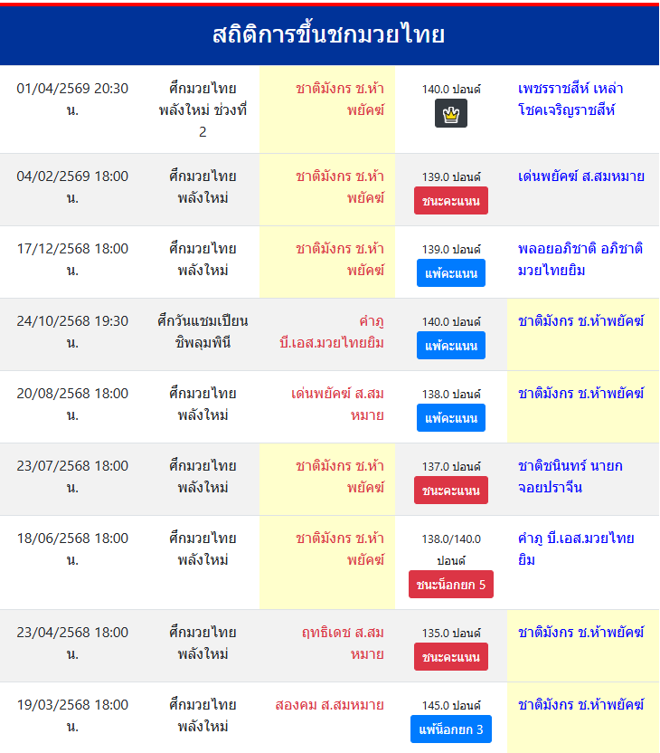 | ชกมาแล้ว | ≥ 100 ครั้ง |