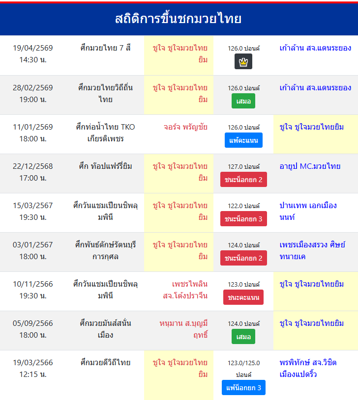 | ขึ้นชกล่าสุด | 28/2/2569 (1 เดือน 17 วัน) |