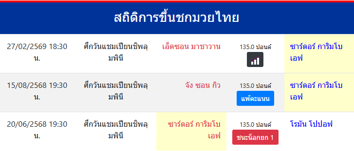 | ขึ้นชกล่าสุด | 15/8/2568 (6 เดือน 11 วัน) |