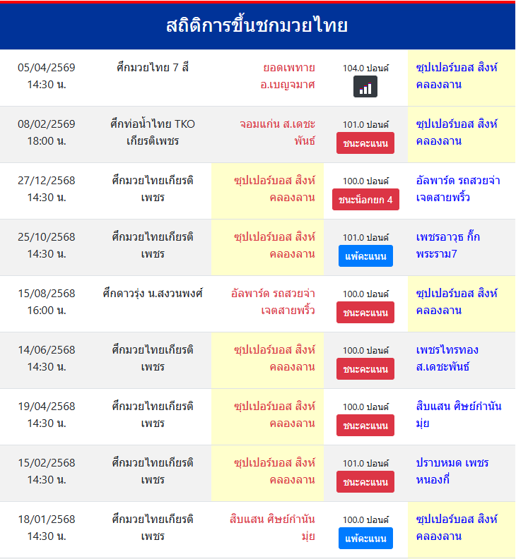| ขึ้นชกล่าสุด | 8/2/2569 (1 เดือน 26 วัน) |