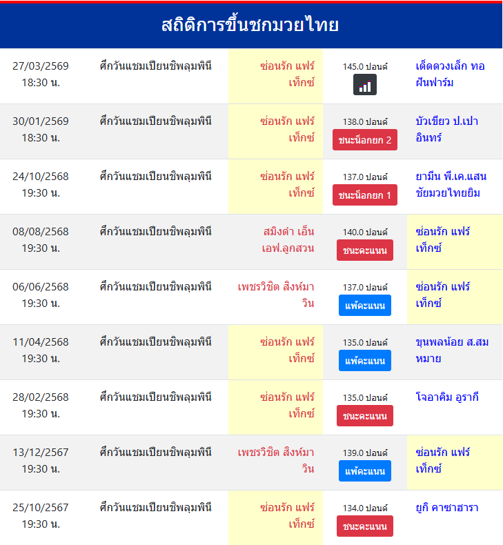 | ขึ้นชกล่าสุด | 30/1/2569 (1 เดือน 23 วัน) |