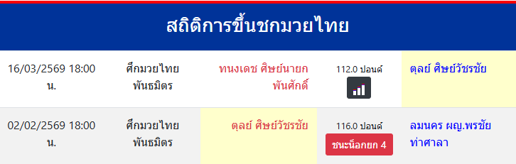 ตุลย์ ศิษย์วัชรชัย "ตุลย์ ศิษย์วัชรชัย" ประเทศ 🇹🇭 ไทย ลีก Muay Thai 0 ชนะ 0 แพ้ 0 เสมอ 0 KO/TKO ประวัติและชีวประวัติ สถิติการขึ้นชกมวยไทยตุลย์ ศิษย์วัชรชัย ขึ้นชกล่าสุด2/2/2569(1 เดือน 12 วัน)การต่อสู้”น้องชาย กริพเพน ราชานนท์”