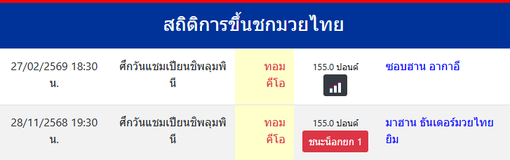 | ขึ้นชกล่าสุด | 28/11/2568 (2 เดือน 29 วัน) |
