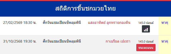 | ขึ้นชกล่าสุด | 31/10/2568 (3 เดือน 26 วัน) |