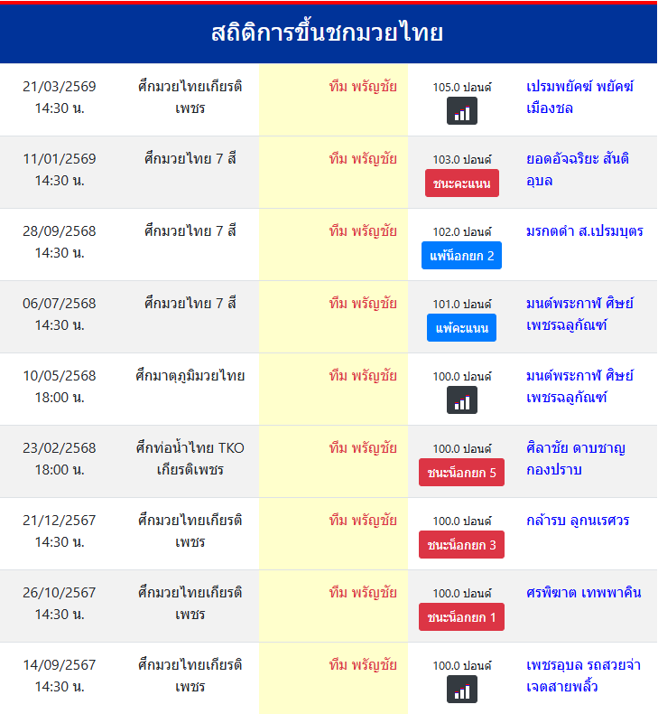 | ขึ้นชกล่าสุด | 11/1/2569 (2 เดือน 8 วัน) |
