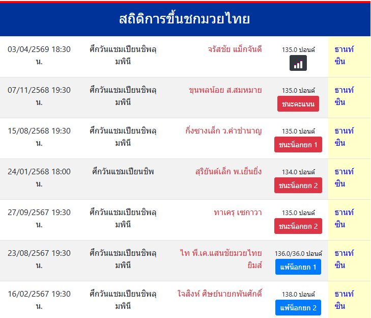 | ขึ้นชกล่าสุด | 7/11/2568 (4 เดือน 26 วัน) |
