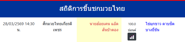 นายฮ้อยเคน แอ๊ดสันป่าตอง "นายฮ้อยเคน แอ๊ดสันป่าตอง" ประเทศ 🇹🇭 ไทย ลีก Muay Thai 0 ชนะ 0 แพ้ 0 เสมอ 0 KO/TKO ประวัติและชีวประวัติ สถิติการขึ้นชกมวยไทยนายฮ้อยเคน แอ๊ดสันป่าตอง จังหวัดอุบลราชธานี