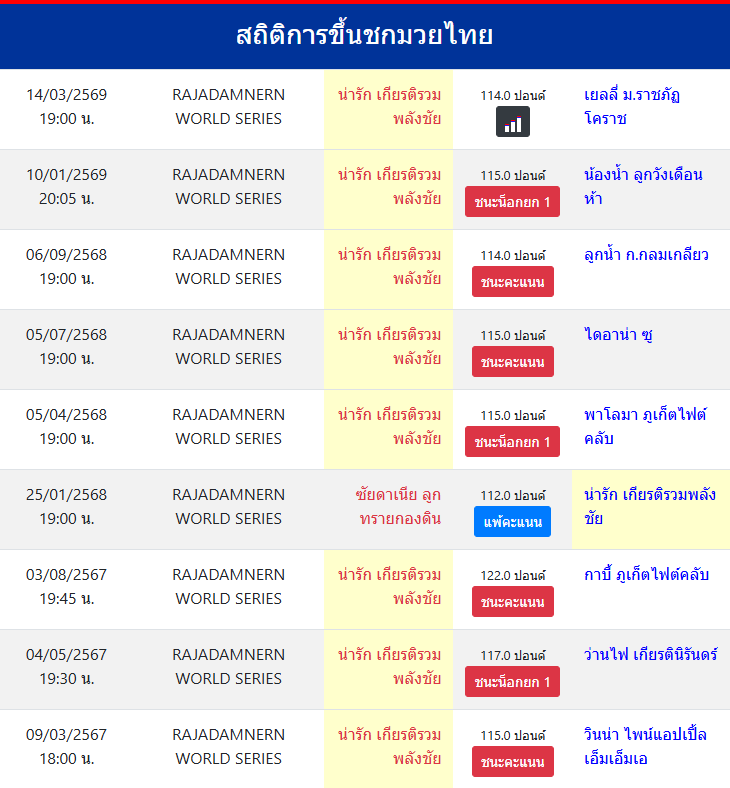 | ขึ้นชกล่าสุด | 10/1/2569 (2 เดือน 1 วัน) |