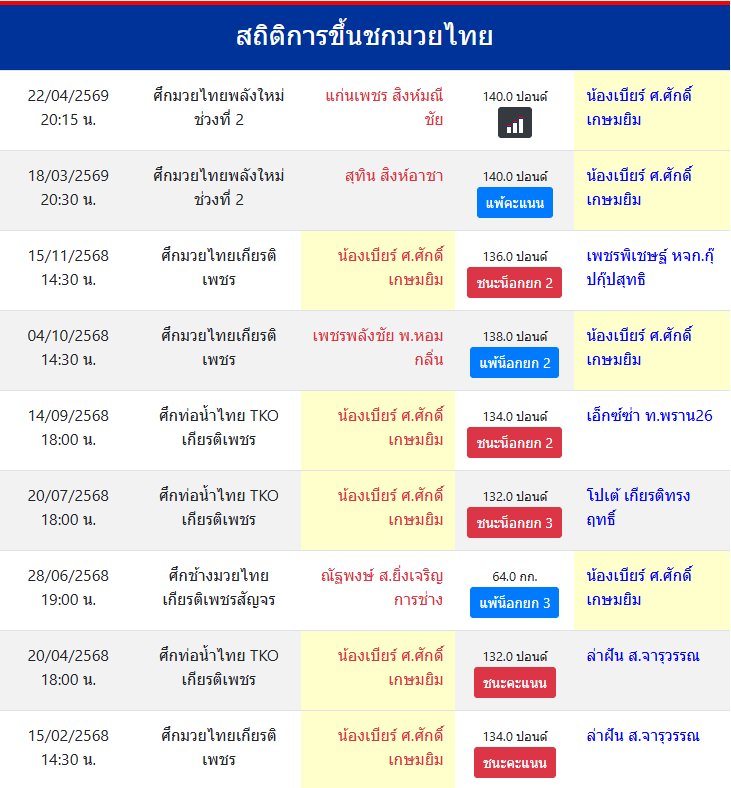 | ขึ้นชกล่าสุด | 18/3/2569 (1 เดือน 3 วัน) |
