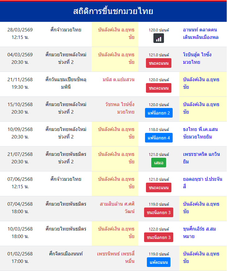 | ชกมาแล้ว | ≥ 100 ครั้ง |