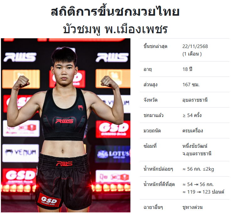 บัวชมพู พ.เมืองเพชร "บัวชมพู ชูทางด่วน" ประเทศ 🇹🇭 ไทย ลีก Muay Thai 0 ชนะ 0 แพ้ 0 เสมอ 0 KO/TKO ประวัติและชีวประวัติ