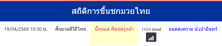 บิ๊กบอส ศิษย์ครูกล้า "บิ๊กบอส ศิษย์ครูกล้า" ประเทศ 🇹🇭 ไทย ลีก Muay Thai 0 ชนะ 0 แพ้ 0 เสมอ 0 KO/TKO ประวัติและชีวประวัติ สถิติการขึ้นชกมวยไทยบิ๊กบอส ศิษย์ครูกล้า