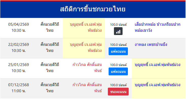| ขึ้นชกล่าสุด | 22/2/2569 (1 เดือน 13 วัน) |