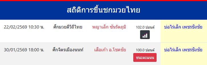 บ่อไร่เล็ก เพชรชิงชัย "บ่อไร่เล็ก เพชรชิงชัย" ประเทศ 🇹🇭 ไทย ลีก Muay Thai 0 ชนะ 0 แพ้ 0 เสมอ 0 KO/TKO ประวัติและชีวประวัติ สถิติการขึ้นชกมวยไทยบ่อไร่เล็ก เพชรชิงชัย ขึ้นชกล่าสุด30/1/2569(22 วัน)