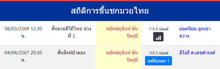 พยัคฆ์ภูสิงห์ ซันรัตภูมิ "พยัคฆ์ภูสิงห์ ซันรัตภูมิ,ยุทธการ TKP.ยิมส์" ประเทศ 🇹🇭 ไทย ลีก Muay Thai 0 ชนะ 0 แพ้ 0 เสมอ 0 KO/TKO ประวัติและชีวประวัติ สถิติการขึ้นชกมวยไทยพยัคฆ์ภูสิงห์ ซันรัตภูมิ ขึ้นชกล่าสุด22/11/2568(3 เดือน 13 วัน)ฉายาอื่นๆยุทธการ TKP.ยิมส์