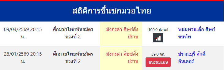 มังกรดำ ศิษย์สั่งปราบ "มังกรดำ ศิษย์สั่งปราบ,ว.วันนิมิตร" ประเทศ 🇹🇭 ไทย ลีก Muay Thai 0 ชนะ 0 แพ้ 0 เสมอ 0 KO/TKO ประวัติและชีวประวัติ สถิติการขึ้นชกมวยไทยมังกรดำ ศิษย์สั่งปราบ ขึ้นชกล่าสุด26/1/2569(1 เดือน 11 วัน)ฉายาอื่นๆว.วันนิมิตร