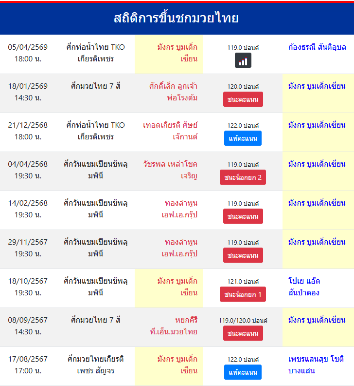 | ชกมาแล้ว | ≥ 100 ครั้ง |
