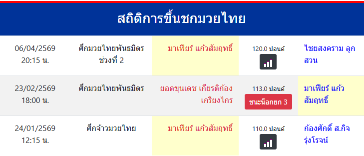 | ขึ้นชกล่าสุด | 23/2/2569 (1 เดือน 13 วัน) |
