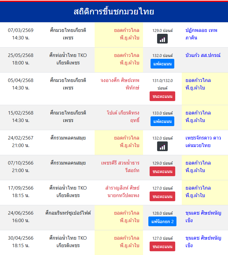 | ขึ้นชกล่าสุด | 8/1/2569 (1 เดือน 24 วัน) |