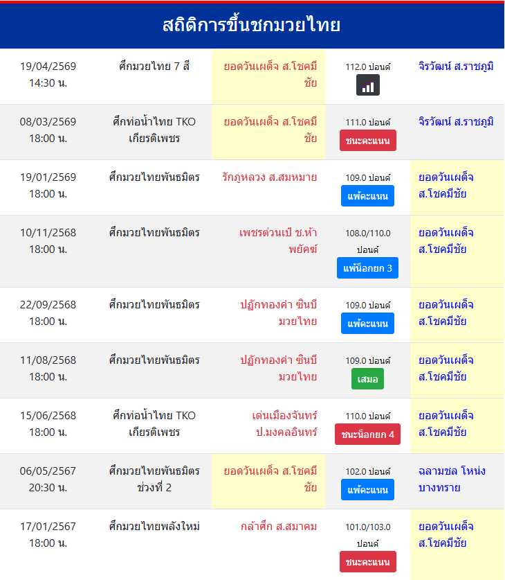 | ขึ้นชกล่าสุด | 8/3/2569 (1 เดือน 6 วัน) |