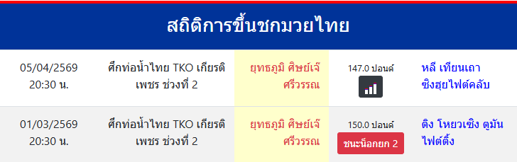 ยุทธภูมิ ศิษย์เจ๊ศรีวรรณ "ยุทธภูมิ ศิษย์เจ๊ศรีวรรณ" ประเทศ 🇹🇭 ไทย ลีก Muay Thai 0 ชนะ 0 แพ้ 0 เสมอ 0 KO/TKO ประวัติและชีวประวัติ สถิติการขึ้นชกมวยไทยยุทธภูมิ ศิษย์เจ๊ศรีวรรณ ขึ้นชกล่าสุด1/3/2569(1 เดือน 3 วัน)อายุ19 ปี