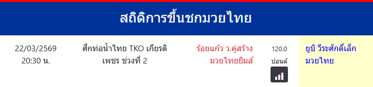 ยูบิ วีระศักดิ์เล็กมวยไทย "ยูบิ วีระศักดิ์เล็กมวยไทย" ประเทศ 🇹🇭 ไทย ลีก Muay Thai 0 ชนะ 0 แพ้ 0 เสมอ 0 KO/TKO ประวัติและชีวประวัติ สถิติการขึ้นชกมวยไทยยูบิ วีระศักดิ์เล็กมวยไทย จังหวัดญี่ปุ่น