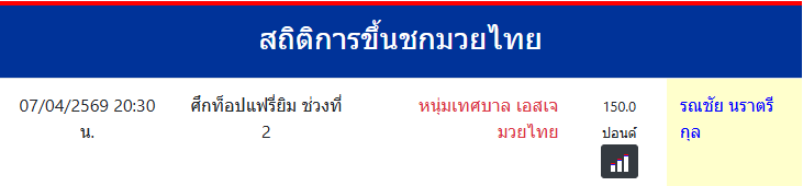 รณชัย นราตรีกุล "พังพอนดำ ขุนศึกตระกุลหยาง" ประเทศ 🇹🇭 ไทย ลีก Muay Thai 0 ชนะ 0 แพ้ 0 เสมอ 0 KO/TKO ประวัติและชีวประวัติ สถิติการขึ้นชกมวยไทยรณชัย นราตรีกุล อายุ43 ปีจังหวัดอ.ท่าศาลา จ.นครศรีธรรมราชฉายาอื่นๆพังพอนดำ ขุนศึกตระกุลหยาง