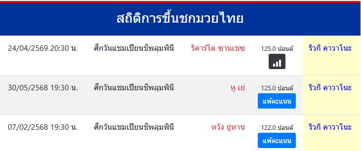 | ขึ้นชกล่าสุด | 30/5/2568 (10 เดือน 24 วัน) |