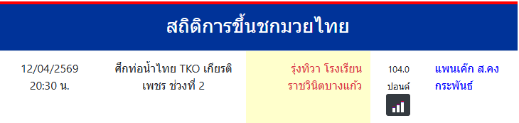 รุ่งทิวา โรงเรียนราชวินิตบางแก้ว "รุ่งทิวา โรงเรียนราชวินิตบางแก้ว" ประเทศ 🇹🇭 ไทย ลีก Muay Thai 0 ชนะ 0 แพ้ 0 เสมอ 0 KO/TKO ประวัติและชีวประวัติ สถิติการขึ้นชกมวยไทยรุ่งทิวา โรงเรียนราชวินิตบางแก้ว ขึ้นชกล่าสุด19/3/2569(23 วัน)