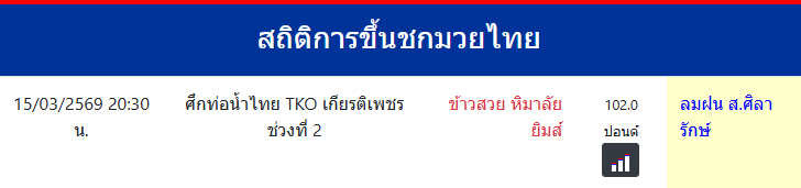 ลมฝน ส.ศิลารักษ์ "ลมฝน ส.ศิลารักษ์" ประเทศ 🇹🇭 ไทย ลีก Muay Thai 0 ชนะ 0 แพ้ 0 เสมอ 0 KO/TKO ประวัติและชีวประวัติ สถิติการขึ้นชกมวยไทยลมฝน ส.ศิลารักษ์