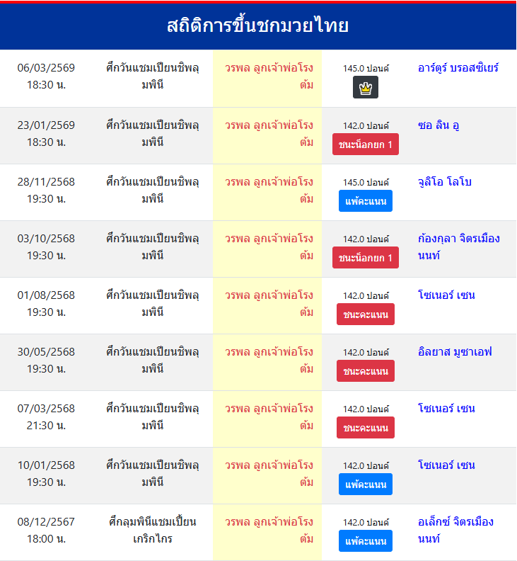 | ชกมาแล้ว | ≥ 100 ครั้ง |