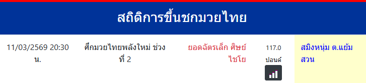 สมิงหนุ่ม ต.แย้มสวน "สมิงหนุ่ม ต.แย้มสวน" ประเทศ 🇹🇭 ไทย ลีก Muay Thai 0 ชนะ 0 แพ้ 0 เสมอ 0 KO/TKO ประวัติและชีวประวัติ สถิติการขึ้นชกมวยไทยสมิงหนุ่ม ต.แย้มสวน