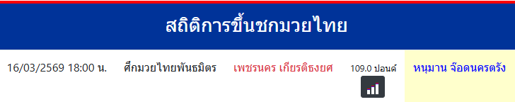 หนุมาน จ๊อดนครตรัง "หนุมาน จ๊อดนครตรัง" ประเทศ 🇹🇭 ไทย ลีก Muay Thai 0 ชนะ 0 แพ้ 0 เสมอ 0 KO/TKO ประวัติและชีวประวัติ สถิติการขึ้นชกมวยไทยหนุมาน จ๊อดนครตรัง