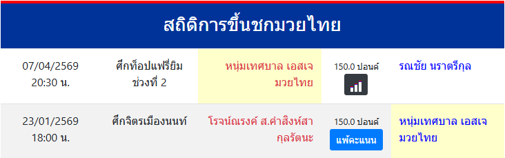 | ขึ้นชกล่าสุด | 23/1/2569 (2 เดือน 13 วัน) |