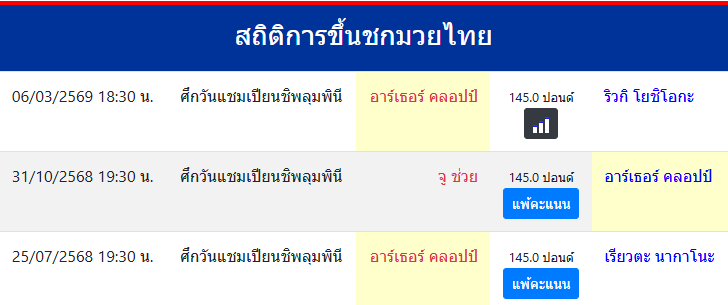 | ขึ้นชกล่าสุด | 31/10/2568 (4 เดือน 2 วัน) |