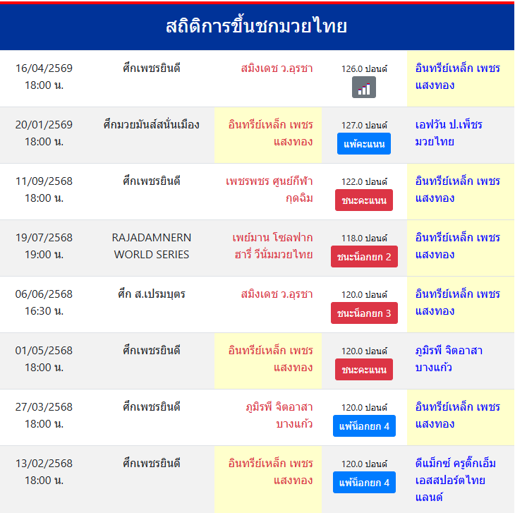 | ชกมาแล้ว | ≥ 50 ครั้ง |