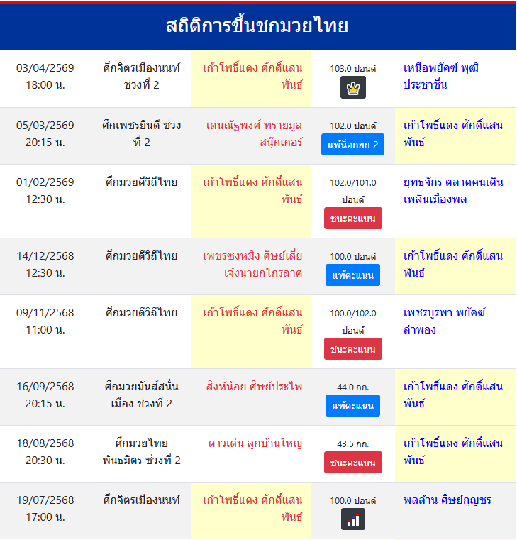 | ชกมาแล้ว | ≥ 50 ครั้ง |
