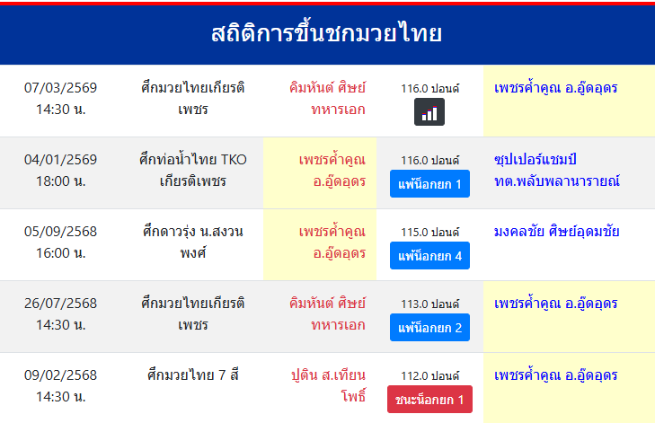 | ขึ้นชกล่าสุด | 4/1/2569 (2 เดือน ) |
